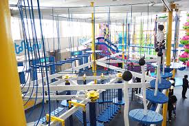 トンデミ平和島は、屋内型のアクティビティ施設。トランポリンやクライミングウォール、ロープコースなど、まるで海外のアスレチックパークのような空間が広がっています。天候に左右されないのが大きな魅力で、雨の日でも猛暑日でも快適に遊べるのがポイント。