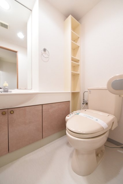 清潔感のある独立型トイレを配置。収納棚を備えた住戸もあり、日用品をすっきり整理できます。