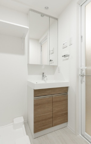 洗面化粧台は独立設置型で、脱衣所と洗面所が分かれているつくりが採用されています。シャンプードレッサータイプの洗面台で、鏡・収納・洗面スペースが使いやすく設計されている点も魅力です。