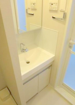 洗面室には独立洗面化粧台(シャンプードレッサータイプ)が設置され、鏡・収納・洗面スペースが使いやすく構成されています。脱衣所と洗面所が分けられている設計により、入浴中でも洗面が使いやすく、朝の身支度時などの混雑を緩和します。 また、洗面台周辺には小物収納スペースが確保されており、日用品の整理にも配慮されています。