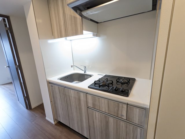 住戸内のキッチンはシステムキッチン仕様で、ガスコンロ2口対応。調理スペースと収納を兼ね備え、使い勝手の良さが魅力です。都市ガス仕様で効率的に調理可能。