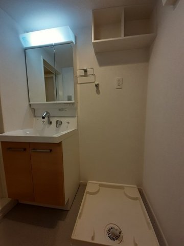 洗面所は居室内で独立しており、洗面化粧台(シャワー付)も標準装備されています。このタイプの設備があることで、「トイレ/浴室」と「洗面所」が分かれて使えるため、朝の準備や来客時にも便利です。さらに、室内洗濯機置場の近くに配置されているため、洗顔・身支度・洗濯といった日常動線もスムーズです。