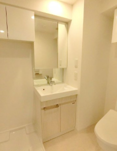 清潔感と使いやすさを兼ね備えたデザインです。収納スペースがしっかり確保されており、化粧品や日用品を整理整頓しやすい造りになっています。大きめのミラーと明るい照明が設置されているため、朝の身支度や夜のスキンケアも快適に行えます。シンプルで洗練されたデザインは、室内全体の雰囲気にも調和し、日々の暮らしをより快適で心地よいものにしてくれます。