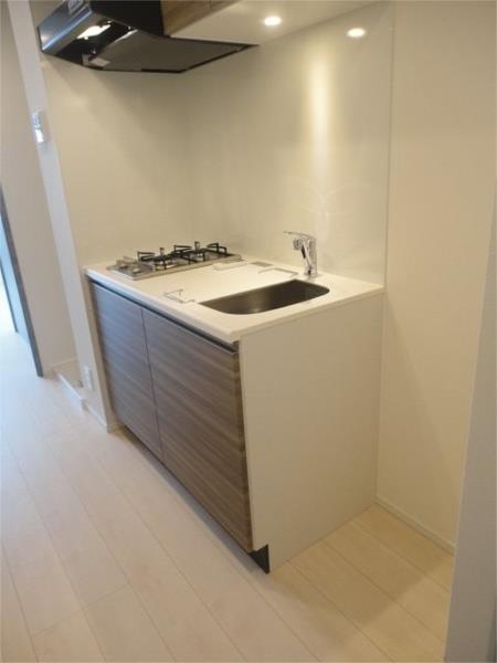 システムキッチンには2口ガスコンロを採用し、効率よく調理ができる実用的な仕様。コンパクトながら収納も確保しており、日々の自炊を快適にサポートします。