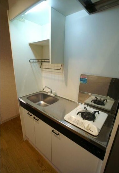 1Kタイプのキッチンはガスコンロ(1口)が設置されており、システムキッチン仕様。給湯設備があり、都市ガスが利用されているタイプです。