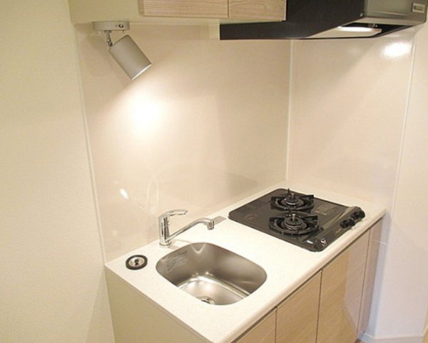 室内のキッチンにはガスコンロが既設されており、2口タイプで調理スペースも十分。システムキッチン仕様で使い勝手がよく、一人暮らしでも効率よく料理できます。