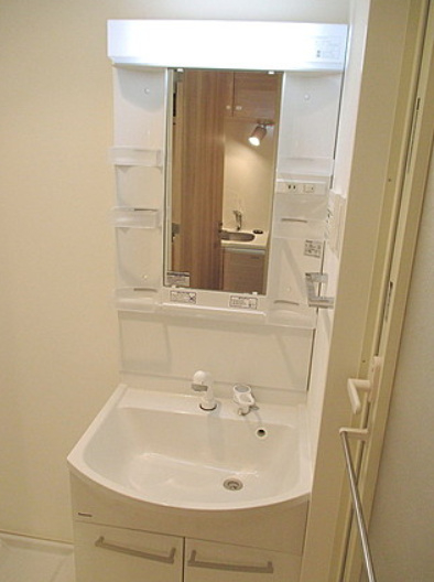 洗面所には独立洗面台があり、鏡付きの化粧台として実用性が高いです。身支度や収納にも便利なスペースが確保されています。