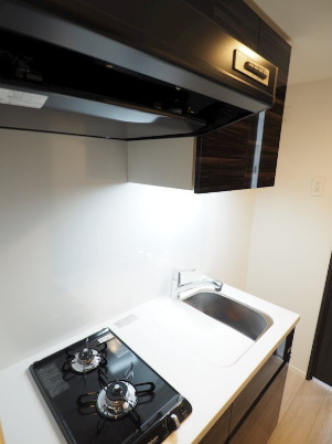 室内にはシステムキッチンが採用され、2口のガスコンロにも対応。効率的な料理が可能で、限られたスペースながら使いやすさを追求しています。