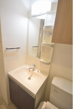 人造大理石カウンターの一体型で、物が散らかりにくい収納付き三面鏡、シャワー付き水栓、曇り止めヒーター付き鏡など、身支度の快適さに配慮された仕様です。