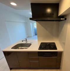 日々の料理がしやすい システムキッチン 仕様です。都市ガス対応で 2口以上のガスコンロ設置可能 なスペースがあり、調理の効率性と使い勝手に優れています。フローリングと一体感のある清潔感ある造りで、キッチン周りの収納も充実。シンク周辺や作業スペースが十分確保されており、単身者からカップルまで幅広いライフスタイルに対応できる機能性が魅力です。さらにキッチン自体が居室とほどよく繋がっているため、リビングとの一体感ある空間設計になっています。