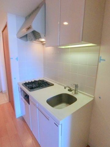 システムキッチンで、ガスコンロ2口対応。料理しやすい独立型キッチンで、コンロや収納スペースもあり一人暮らしから自炊を楽しむ方まで使いやすい仕様です。都市ガス給湯で効率的に調理できます。