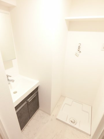 独立したスペースとして確保されており、シャワー付き洗面化粧台が設置されています。朝の身支度や帰宅後の手洗いなど、生活動線がスムーズになる設計です。単に洗面機能だけでなく、収納や鏡付きで使い勝手にも配慮されています。