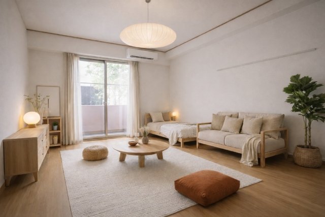 フローリング仕上げ で、清潔感と落ち着いた雰囲気があり家具も配置しやすい空間です。室内は1Kの間取りを基本としており、単身者の生活に最適な広さが確保されています。クローゼットやシューズボックスなどの収納設備も設置されているため、洋服や日常用品の整理がしやすく、生活動線がすっきり保てます。またエアコンが標準装備されているため、季節を問わず快適に過ごせる居住空間となっています。窓からの採光によって室内全体が明るく開放的な印象になり、一人暮らしのベースとして機能的で心地よい空間を提供します。