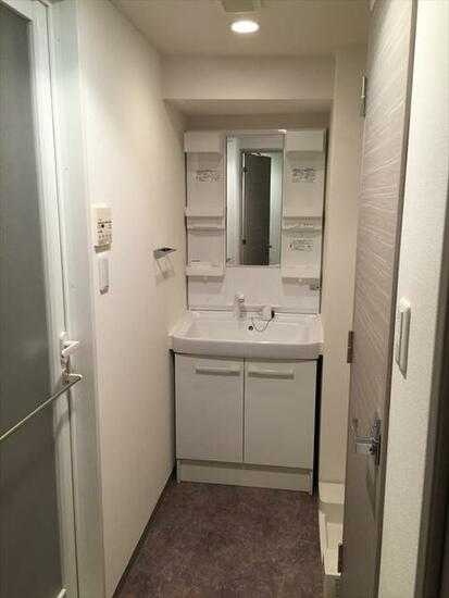 独立洗面台(洗面化粧台)が設置されており、朝の身支度や夜のケアがしやすい設計になっています。洗面台周りのスペースは脱衣所と一体になっているため、入浴前後の動線がスムーズで快適です。また、鏡や収納スペースが確保されていることで、化粧品や日用品の整理もしやすく、日々の生活動線を考えたつくりになっています。