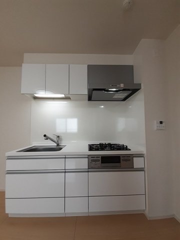 機能性とデザイン性を兼ね備えた システムキッチン を採用。複数口の ガスコンロ(2口以上) が設置されており、調理スペースも確保されています。日々の自炊や料理がしやすく、浄水器付きでおいしい水が使えるのもポイントです。収納も適宜配置されているため、調理道具や食材の整理がしやすい設計です。フローリングと統一された空間で、リビングダイニングとの一体感も感じられます。