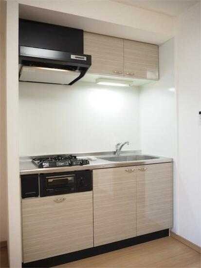 システムキッチン を採用し、2口コンロ対応可能なガス台スペースを備えています。調理スペースは効率的に設計されており、日常の料理をスムーズに行えるレイアウトです。キッチン周りには収納棚や作業スペースも確保され、調理器具・食器の整理がしやすい環境です。ガスコンロ設置可能で自炊派にも配慮された仕様になっています。