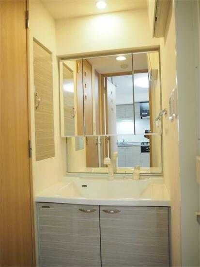 独立洗面所 を完備しており、洗面・身支度スペースがバスルームと別になっています。洗面化粧台は鏡付で収納スペースも併設され、朝の準備や洗顔・歯磨きがしやすい設計です。脱衣スペースとして使えるため、プライバシーや使い勝手が高く、居住者からの人気も高いポイントです。